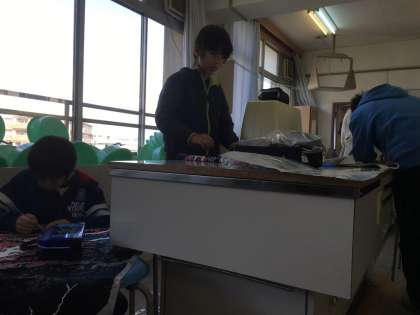 簡単に説明するとアイロンをかけて、しるしをつけて、ミシンで縫い付け、ひもを通したらできあがりです。