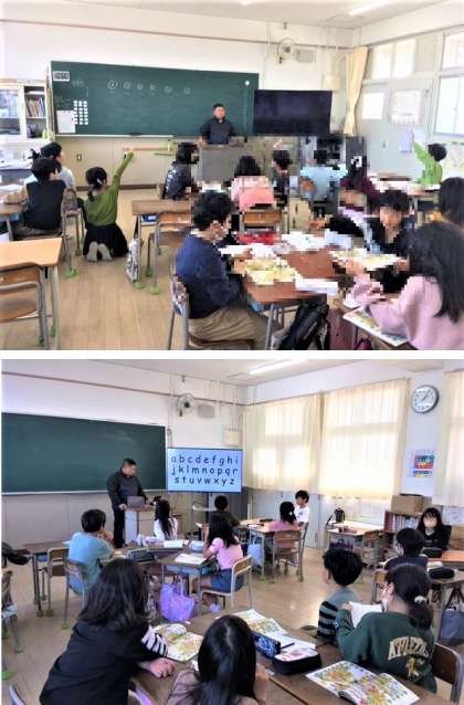 3・4年生の教室では、Melvin先生のアルファベットクイズなどの楽しい授業に、教室中が子ども達の笑顔と明るい笑い声に包まれていました。(写真上2枚3年、写真下2枚4年)