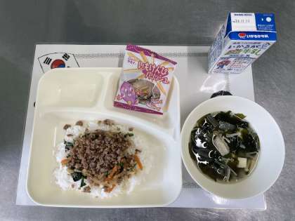 今日の献立は、ビビンバ、わかめスープ、いもけんぴフィッシュ、ごはん、牛乳です。
