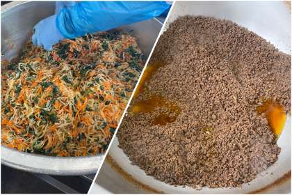 ビビンバは、だいこん、ほうれんそう、にんじんなどの野菜と肉を混ぜて食べました。