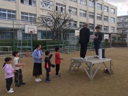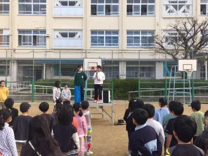 本日の児童朝会では、保健委員から手洗い週間の話と、バスケットボールチームの表彰がありました。