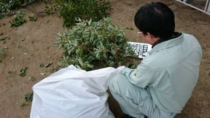本日、管理作業員さんがくすのきの剪定をしました。二人で協力して、井高野中学校との塀のこちら側に生えているくすのきを二人で協力してきれいにしました。