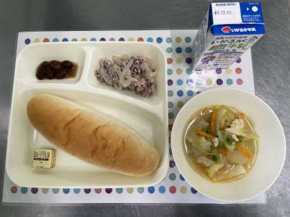 今日の献立は、豚肉のバジル焼き、スープ、うずら豆のグラッセ、コッペパン、バター、牛乳です。