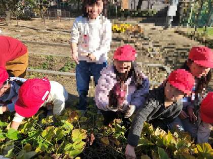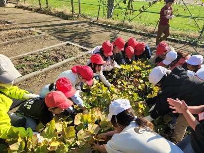 いもほりをしました。しっかりと育ったつるの根元を掘っていくと、きれいな色のサツマイモが顔を出し、子どもたちは喜びの声を上げていました。おいもが傷つかなようにと、周りの土を優しく掘っていました。子どもたちの顔の大きさよりも大きいかな、、と思うほどのものも掘ることができて、みんな驚いていました。サツマイモの絵を描いたり、つるで遊んだりして楽しみたいと思います。