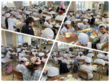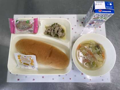 今日の献立は、豚肉と野菜のソテー、スープ、スイートポテト、コッペパン、マーマレード、牛乳です。