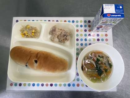 今日の献立は、鶏肉のからあげ、ハムと野菜の中華スープ、もやしとコーンの中華あえ、レーズンパン、牛乳です。