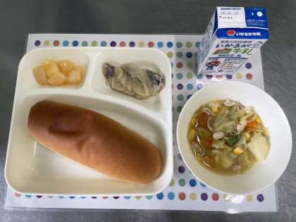 今日の献立は、あじのレモンマリネ、てぼ豆のスープ煮、白桃(カット缶)、黒糖パン、牛乳です。