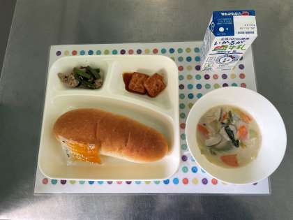 今日の献立は、はくさいのクリーム煮、あつあげのピリ辛じょうゆかけ、豚肉とさんどまめのオイスターソースいため、コッペパン、みかんジャム、牛乳です。