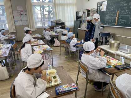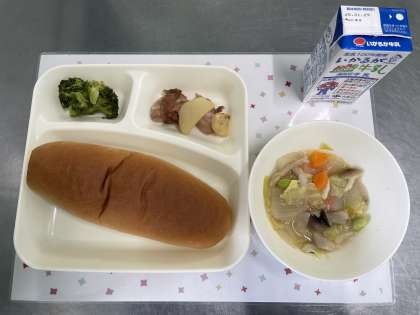 今日の献立は、鶏肉とじゃがいものガーリック焼き、スープ煮、ブロッコリーのサラダ、黒糖パン、牛乳です。