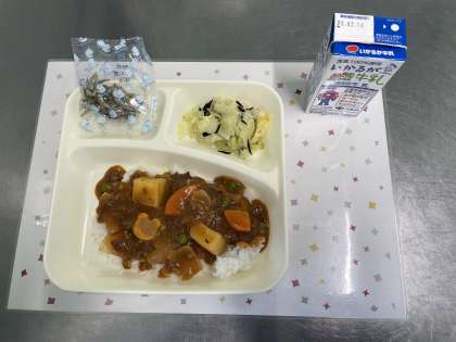 今日の献立は、ハヤシライス、キャベツのひじきドレッシング、ミニフィッシュ、ごはん、牛乳です。