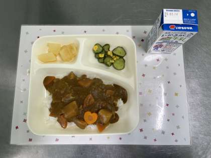 今日の献立は、チキンレバーカレーライス、きゅうりとコーンのサラダ、洋なし(カット缶)、ごはん、牛乳です。