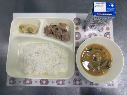 今日の献立は、豚肉のしょうが焼き、みそ汁、高野どうふの煮もの、ごはん、牛乳です。