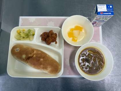 今日の献立は、あげどりのバーベキューソース、カレースープ、キャベツとコーンのサラダ、フルーツゼリー、おさつパン、牛乳です。