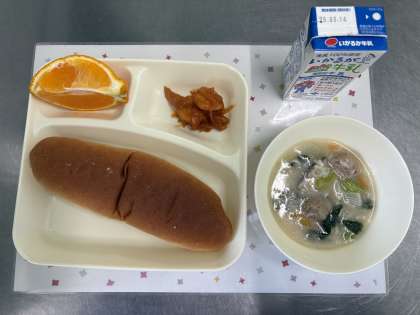 今日の献立は、えびのチリソースいため、中華がゆ、デコポン、黒糖パン、牛乳です。