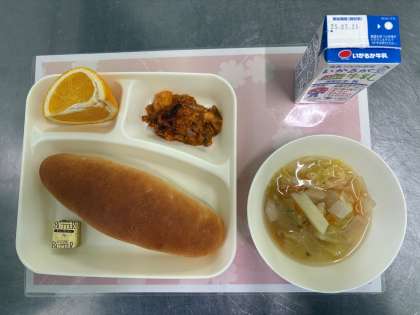 今日の献立は、とうふのミートグラタン、じゃがいもと野菜のスープ、はっさく、コッペパン、バター、牛乳です。