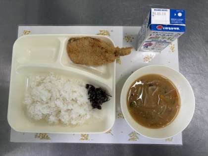 今日の献立は、いわしフライ、みそ汁、牛ひじきそぼろ、ごはん、牛乳です。