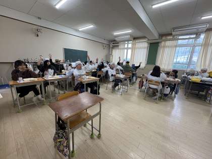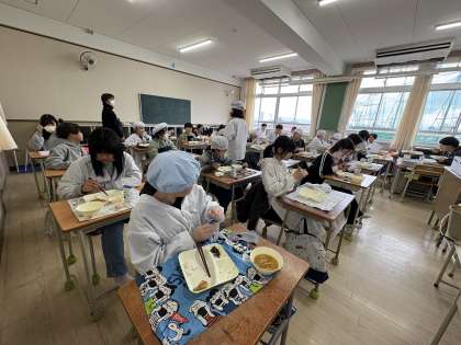 今日は、6年生にとって小学校生活最後の給食でした。給食室では、「6年間おいしい給食をありがとうございました!」、「今日もおいしかったです!」と、感謝の気持ちを給食調理員さんに伝える6年生の姿が見られました。