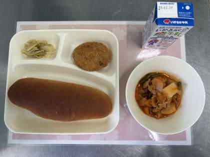 今日の献立は、チキンレバーカツ、ケチャップ煮、ツナとキャベツのバジルソテー、黒糖パン、牛乳です。