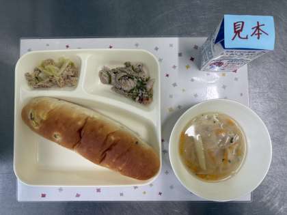 今日の献立は、豚肉のガーリック焼き、スープ、ツナとキャベツのソテー、おさつパン、牛乳です。