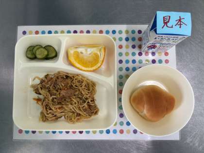 今日の献立は、焼きそば、きゅうりのしょうがづけ、あまなつかん、ミニコッペパン、牛乳です。
