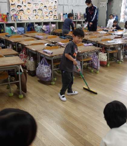 今日から始まった5時間授業。子どもたちは給食が終わり、もう1時間頑張る学校の活動に一日ですが少し疲れを感じましたが、少しずつでも慣れていってほしいと思います。同時に初めての昼休み、清掃活動。自分たちの使った教室や、廊下などを自分できれいにします。しっかりとゴミやほこりの混じっているところを見つけると、「おおーーーっ!」と、俄然やる気があがり一生懸命掃いていました。