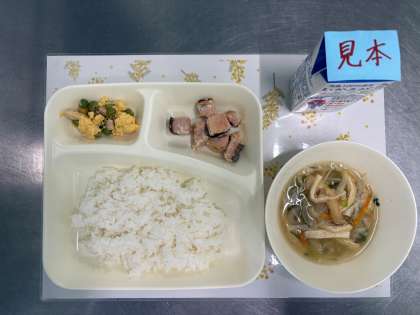 今日の献立は、さけのみそ焼き、五目汁、えんどうの卵とじ、ごはん、牛乳です。