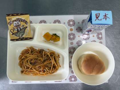 今日の献立は、ミートソーススパゲッティ、焼きかぼちゃ、カレーフィッシュ、ミニコッペパン、牛乳です。