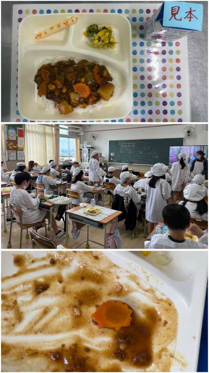 牛肉と大豆のカレーライスは、たんぱく質を多く含む大豆がごろごろ入っていて、おいしくたべることができました。今日のカレーには、星やくま、ハリネズミの形をしたラッキーにんじんが入っていました。