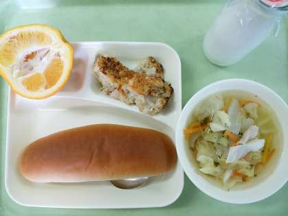パン・牛乳・押し麦のグラタン・スープ・いよかんです。