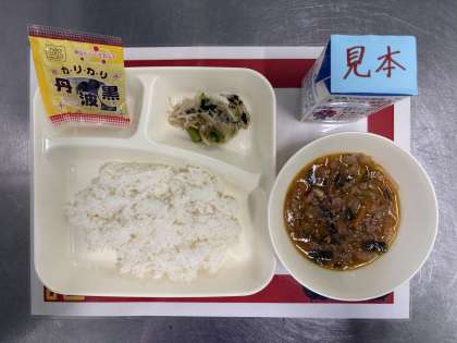 今日の献立は、マーボーはるさめ、チンゲンサイともやしの甘酢あえ、いり黒豆、ごはん、牛乳です。