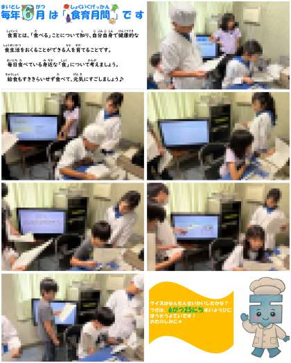 毎年6月は食育月間です。今日は、給食委員会の6年生の児童が、テレビ放送で給食クイズを行いました。旬の野菜や果物など食べ物に関するクイズを行い、食に関する興味を高めることができました。