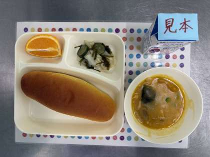 今日の献立は、鶏肉とかぼちゃのシチュー、ミックス海そうのサラダ、オレンジ、パンプキンパン、牛乳です。