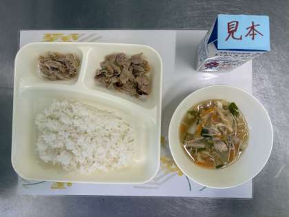 今日の献立は、豚肉のごまみそ焼き、五目汁、ツナともやしのいためもの、ごはん、牛乳です。