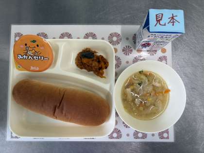 今日の献立は、かぼちゃのミートグラタン、スープ、みかんゼリー、黒糖パン、牛乳です。