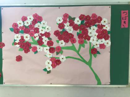 1月の「節分の鬼」に続き、2月は「ツバキの花」をテーマにした掲示物を作りました。