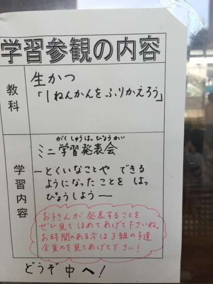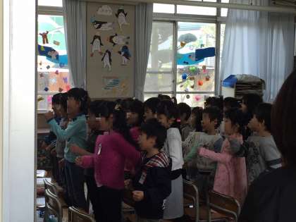 一人一人が保護者の前に自信を持って発表している姿に感動しました。また「さんぽ」の合唱では、歌うだけでなく振りも付けていました。とても可愛らしく、一年生らしさが伝わってきました。