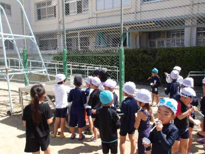 今日はプールの前に、みんなでシャボン玉遊びをしました。微妙な水加減でうまくいったりいかなかったり。もっとこうしたらどうだろうとみんな考えながら工夫していました。