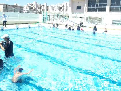 そして、プールでは、身体を浮かせる遊び、そして最後は宝さがし遊びをしました。「とどかへん、とどかへん!」と言いながら楽しく宝さがしをしていました。