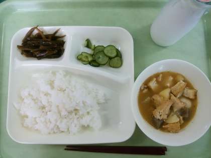 米飯・牛乳・関東煮・あっさりきゅうり・茎わかめの佃煮です。