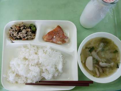 米飯・牛乳・赤魚のレモン醤油掛け・うすく汁・高野豆腐の炒り煮です。