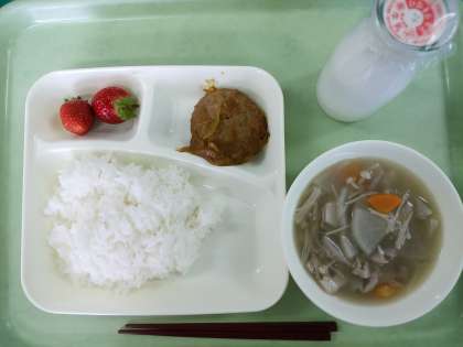 米飯・牛乳・カレーハンバーグ・根菜たっぷりスープ・いちごです。