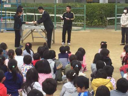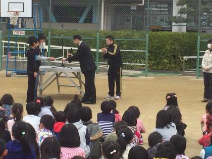 まず最初に校長先生よるバスケットボールの試合で活躍した2名の児童の表彰がありました。そして、全児童を対象にした「手洗い・うがい」の表彰もありました。大変よくがんばりましたね。