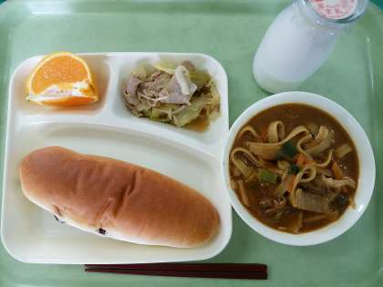 パン・牛乳・みそきしめん・豚肉と野菜の炒め物・清見オレンジです。