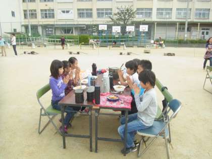 毎年、4年生を対象に、来年の林間学習で困らないようにということで、PTAが主催してカレー作りをしています。6,7人のグループに分かれて、子どもたちが中心になって、買い物に行き、野菜を切り、火をおこし、見事おいしいカレーが完成しました。