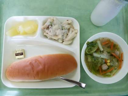 パン・バター・牛乳・マカロニグラタン・レタスのスープ・りんごです。
