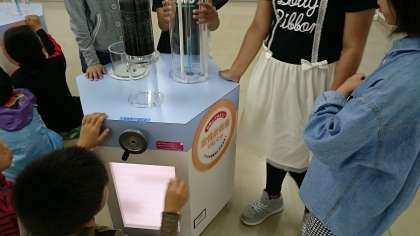 活性炭で水をきれいにしています。青色の水が透明になりました。