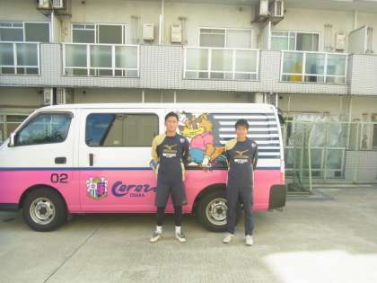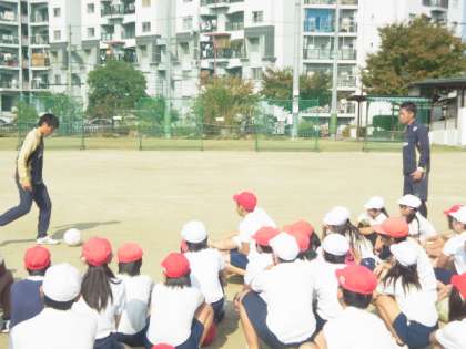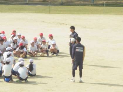 準備運動から始まって、パス練習や実戦形式の試合をしながら、セレッソ大阪のコーチ二人にさわやかに指導をしていただきました。