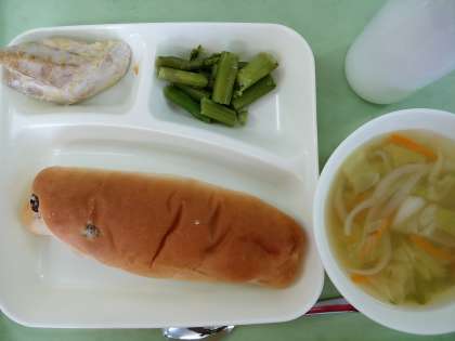 パン・牛乳・鰹のガーリックマヨネーズ焼き・スープ・グリーンアスパラのソテーです。