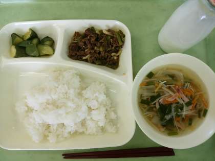 米飯・牛乳・チンジャオニューオウスー・ハムと野菜の中華スープ・きゅうりの辛みづけです。