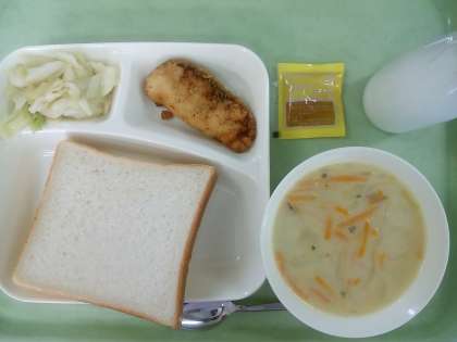 パン・アプリコットジャム・牛乳・サーモンフライ・豆乳コーンスープ・キャベツのソテーです。